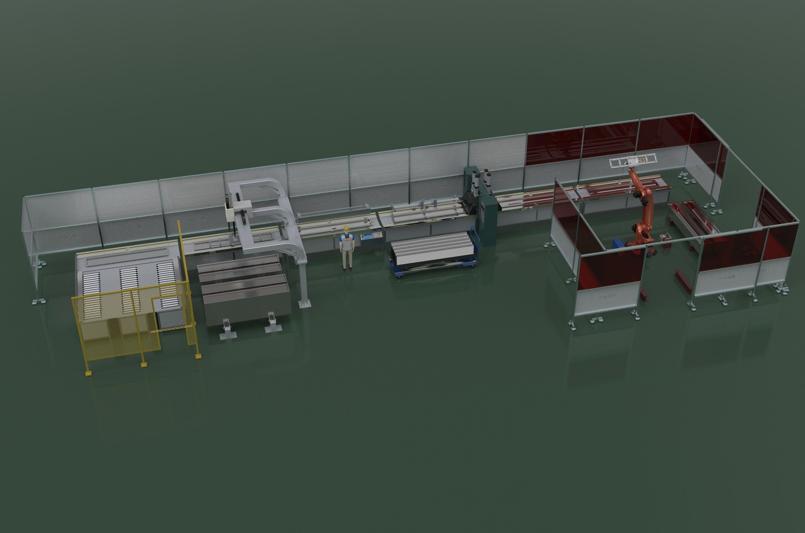 5、焊機(jī)及成品下料區(qū): 通過設(shè)備進(jìn)行自動(dòng)焊接,焊接高度小于門板鐵皮高度,當(dāng)焊接完成后,機(jī)器人工位自動(dòng)翻轉(zhuǎn),使用吸盤進(jìn)行自動(dòng)取下,按預(yù)定軌跡進(jìn)行堆放,當(dāng)一個(gè)成品料堆,堆放達(dá)到指定要求時(shí),系統(tǒng)給予提示,并自動(dòng)選擇另一個(gè)堆放平臺(tái)進(jìn)行下料,保證下料料堆更換線體不停機(jī)。機(jī)器人選用庫卡 KR210R2700EXTRA。